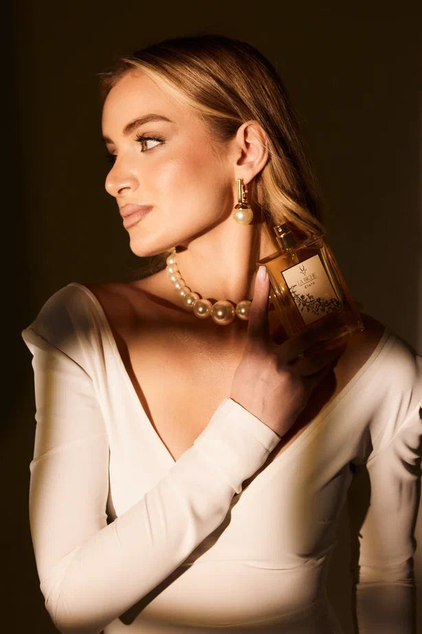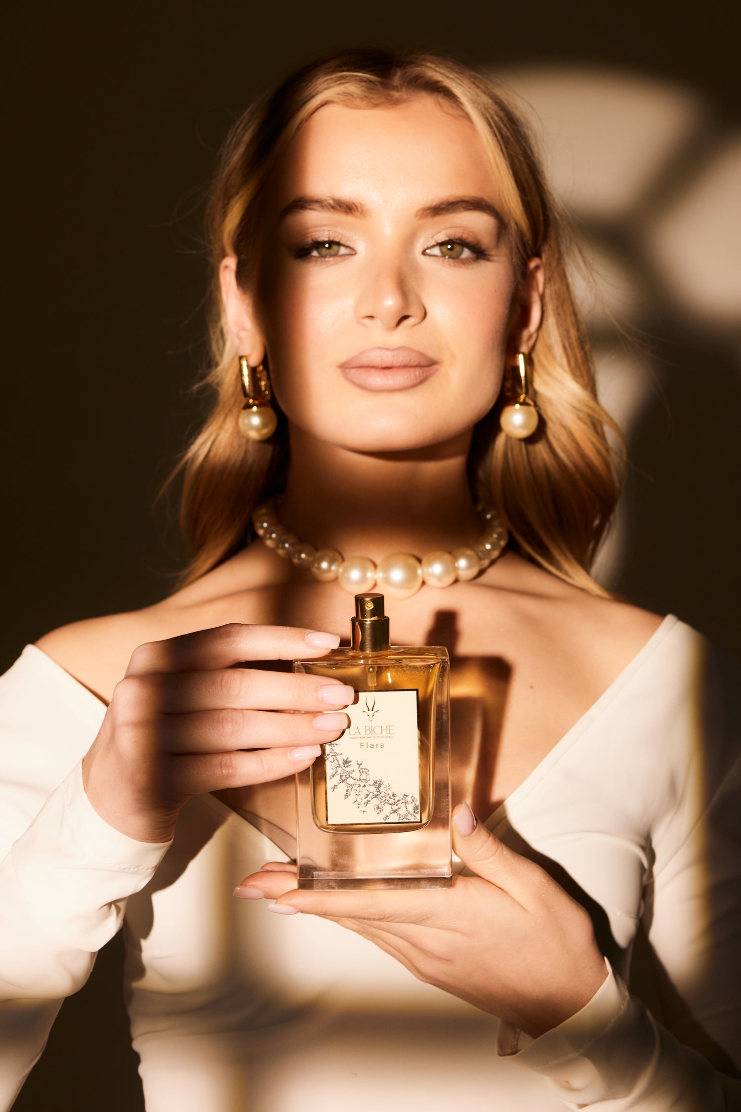 Elara glows with fruity softness, unfolds into lush white florals, and finishes with creamy woods and vetiver. It’s elegance with a wild edge — refined, radiant, and modern.